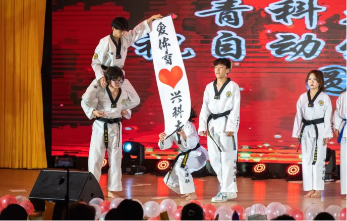 民族舞《多彩民族韵》用上下五千年的国风故事与翩翩舞姿的巧妙结合,弘扬民族精神同时,展现出中华民族隽永平和的博大民族气韵。强体魄才能兴中华,兴体育方能振中国,大学生体育联盟代表进行的体育成果展示是“自”家人始终坚持“爱体育,兴科大”的最好体现;小品《谁杀死了周末》则在幽默中提醒同学珍惜时间,不负青春大好时光;少年的热血记忆永不褪去,激昂的音乐传达你我思绪,乐队表演的《逆战》《海阔天空》带领同学们一同感受打击乐的魅力,为同学们找到前进的方向,点亮心中的梦想。第二篇章在音阶悦动、乐符环绕的欢乐氛围中结束。