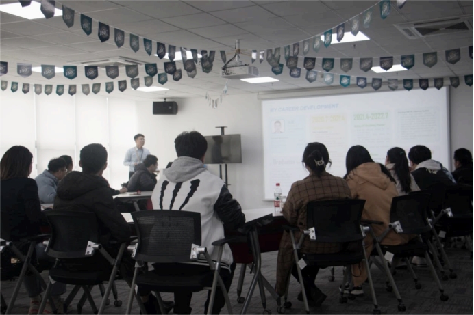 提问分享环节,三名优秀毕业生就自己入职后的工作、职业发展进行了分享,同学们就如何找准自身定位、如何看待女性职场歧视、科研的主要方向以及入职要求等方面进行提问,公司研发工程师、人力资源经理分别回答了同学们的问题。